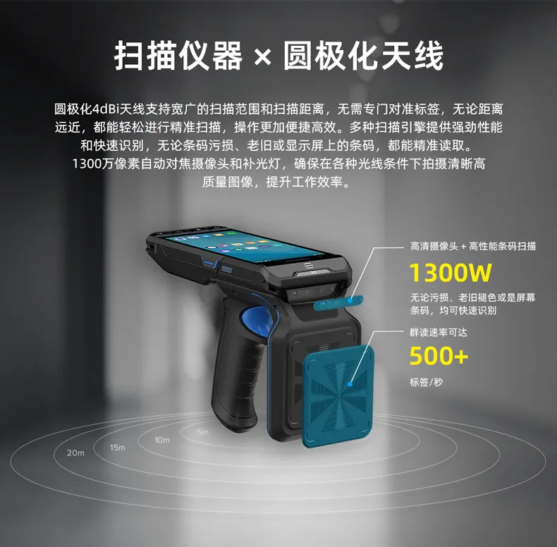 The product has excellent RFID read/write performance and multi-tag inventory capability, which can quickly and accurately read and write information on RFID tags and support simultaneous identification of multiple tags, greatly improving work efficiency. The new generation of self-developed high-performance antenna further enhances the stability and reliability of reading tags and ensures the accuracy of data collection.