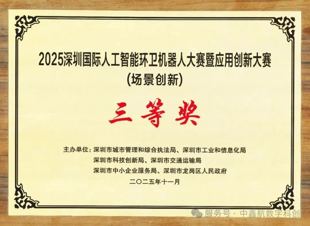 秋色宜人,创新涌动。在这个收获的季节,中鑫航&深信大校企联合研发中心迎来高光时刻——在刚刚落幕的2025深圳国际人工智能环卫机器人大赛暨应用创新大赛上,双方共同研发的空地一体智能无人系统荣获场景创新赛三等奖,展现了智能无人系统研发的卓越实力。